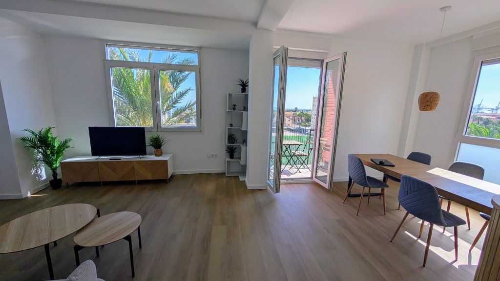 Welcome to this spacious, newly completely renovated apartment (March 2025) on the top corner floor of a small-scale building in the popular El Cabanyal District of Valencia. The flat combines peace, space and comfort with stunning sea views. Ideal for a stay in the city, a 5-minute walk from the beach and the bustling city life.